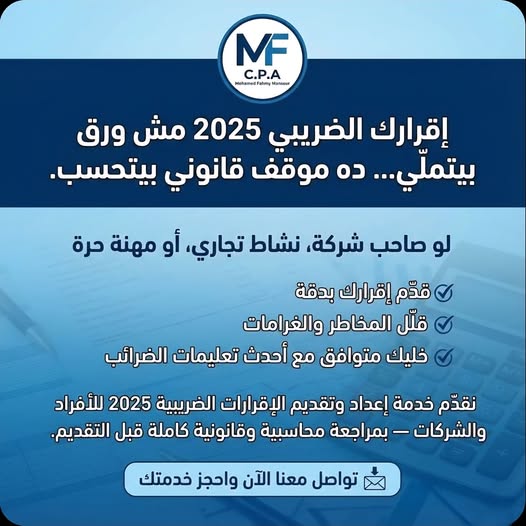 اقرأ المزيد📞 جاهز تقدم إقرارك الضريبي 2025؟ سواء: 🔹 نشاط فردي 🔹 شركة 🔹 إقرار صفرى 🔹 أو عندك رقم أعمال 📑 مك...